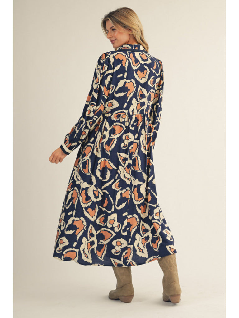 Embrace effortless charm with the Addison Dress—a navy, long-sleeved boho floral midi featuring playful side pockets and a collared neckline. The solid contrast details add a fun twist, making this dress perfect for twirling through your day in style and comfort.