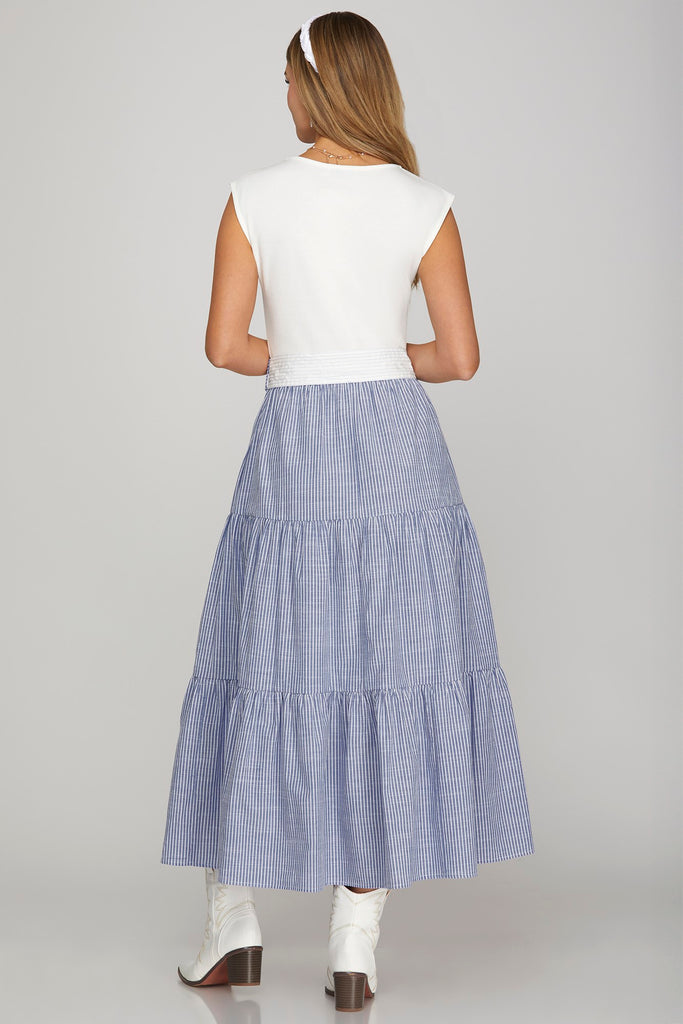 Introducing the Heather Dress—your new go-to for effortless style with serious personality. This charming midi features a playful knit and woven combo stripe that catches the eye, while drop sleeves add that relaxed, modern vibe. The tiered silhouette keeps things flowy and fun, and we didn't forget the details: delicate stitching at the waist, a tie detail to cinch and customize your fit, and pockets (because pockets are always a win). Dress it up or down—this versatile piece is ready for whatever your day brings.