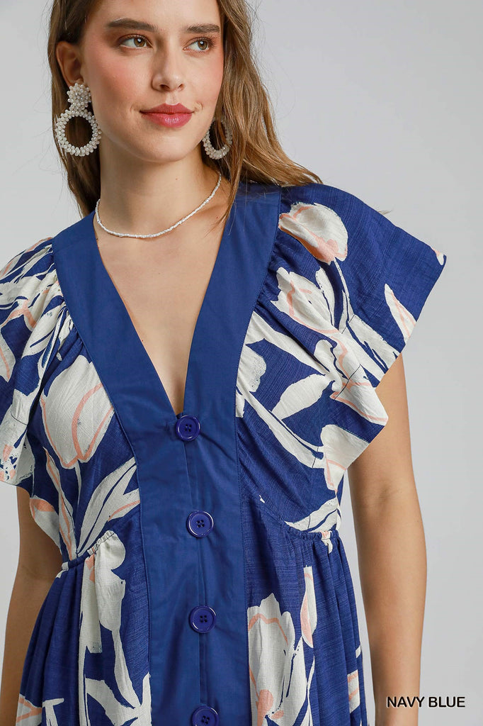Introducing the Madaline Dress—your new go-to for effortless style! This botanical beauty features a flattering deep V-neckline and button-front design that lets you customize your look. Flutter sleeves add a playful touch, while the bold floral print brings personality to any occasion. The flowy A-line silhouette skims beautifully over your curves, making it perfect for everything from brunch dates to garden parties. Unlined for breathable comfort all day long.
