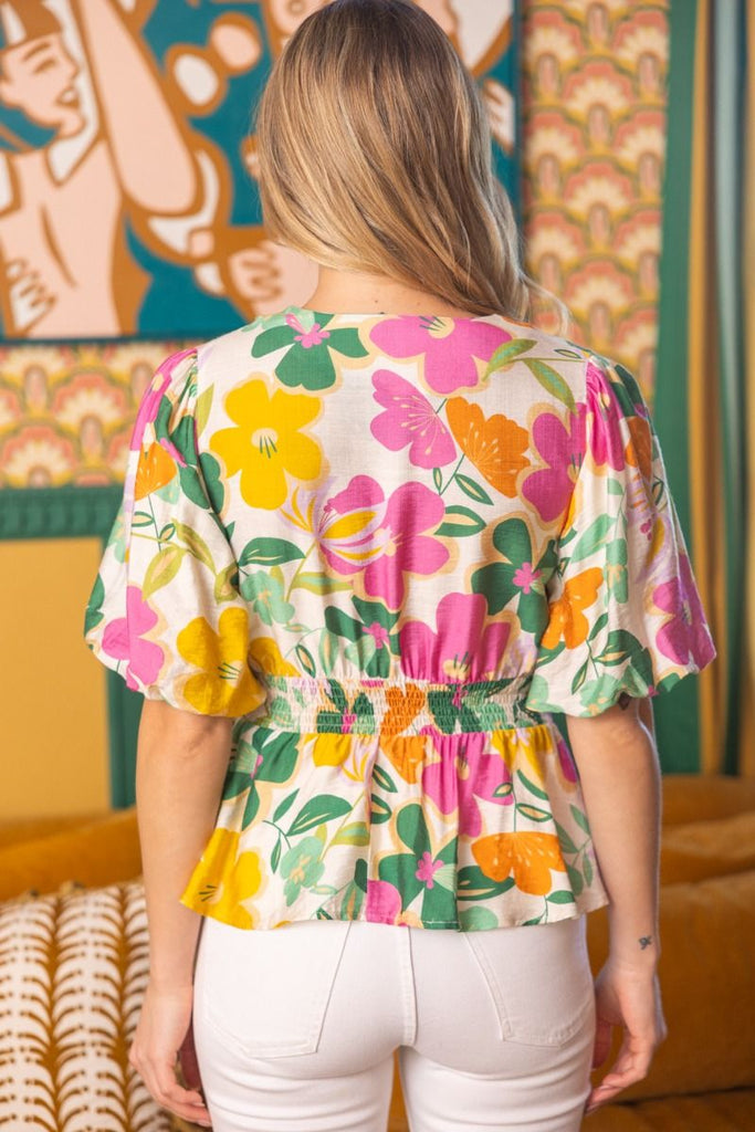 Stay on trend with this boho floral peplum top, a must-have for Spring/Summer 2026. Featuring a smocked waist, puff sleeves, and a chic zip V-neck, this vibrant floral blouse blends soft femininity with a retro aesthetic. Perfect for casual or festival looks!