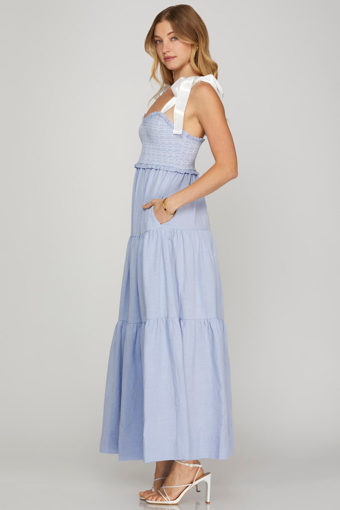 The Shiloh Dress is your go-to piece for effortless elegance with a fun twist. This light blue woven maxi features eye-catching contrast smocking at the shoulders and a flowy tiered silhouette that moves beautifully with you. The satin tie detail adds a touch of sophistication, while the relaxed fit keeps things comfortable all day long. Perfect for everything from brunch dates to garden parties—dress it up or down and feel fabulous.