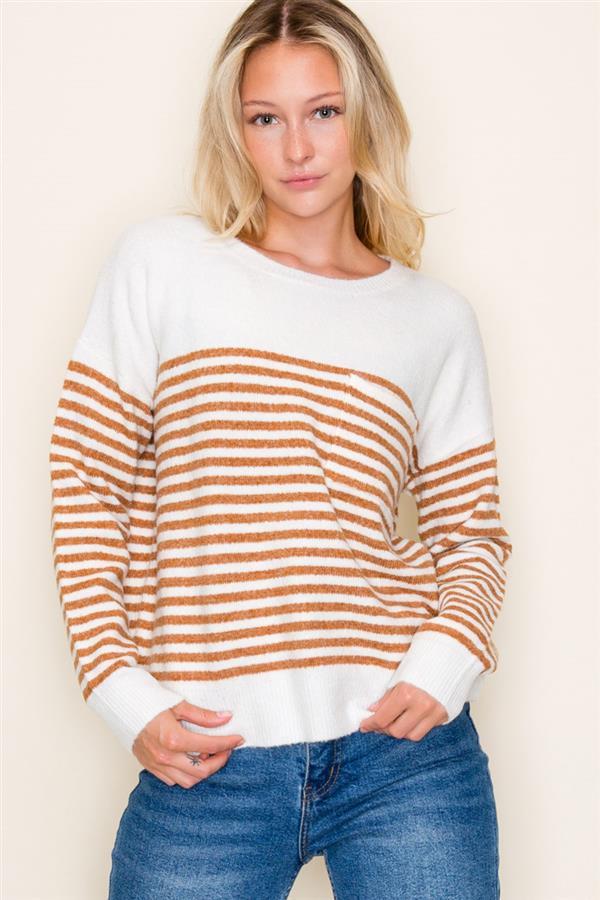 Cozy up in the Sophie Sweater, where playful tan stripes meet a super soft feel. With a chic chest pocket, classic crew neck, and long sleeves, this stripe-blocked sweater adds a fun twist to your casual look while keeping you comfy all day long. Perfect for layering or wearing solo, it’s your new go-to for effortless style and warmth.