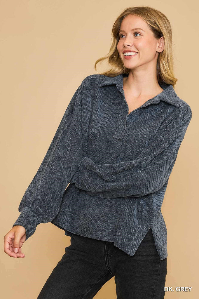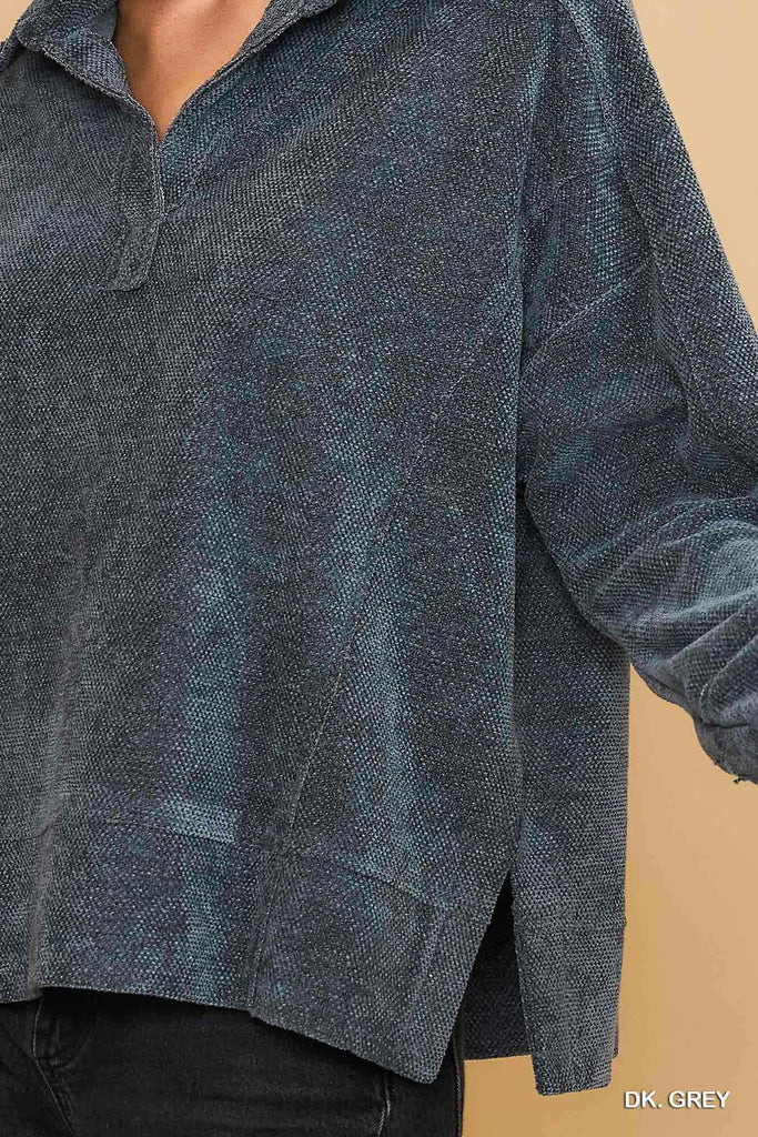 Cozy up in our Stephanie Top, a dark grey chenille sweatshirt that's all about that relaxed vibe. The loose fit gives you room to breathe and move, while the soft chenille fabric feels like a warm hug. Perfect for lazy days, coffee runs, or whenever you need comfort without sacrificing style. Layer it, dress it down, or wear it solo—this versatile piece is your new go-to for effortless cool.