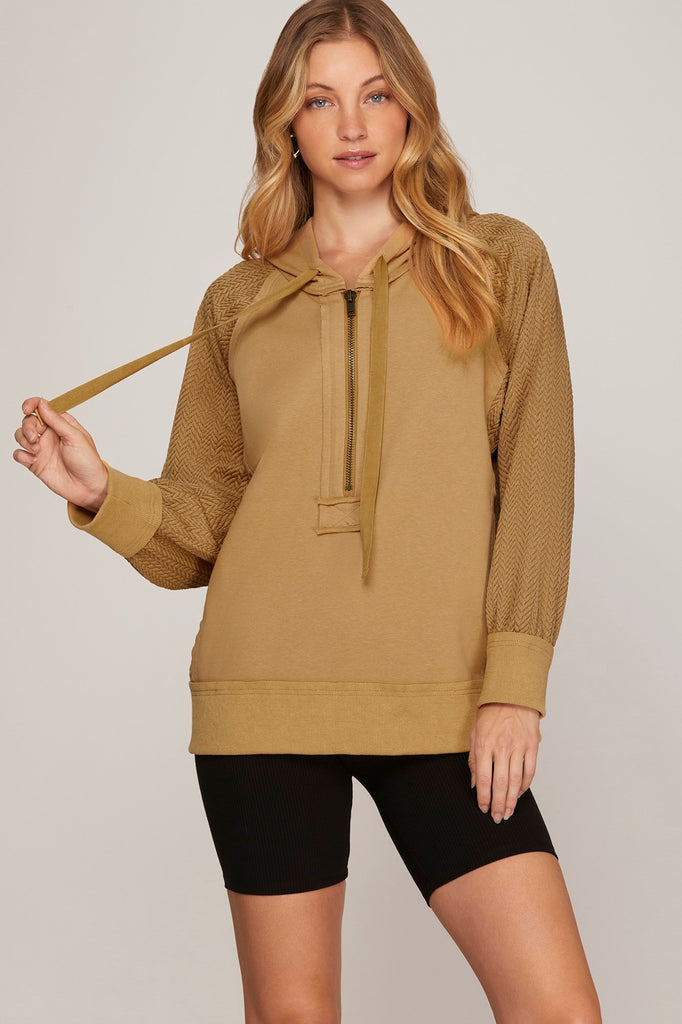 Camel color sweatshirt with half zip front.
