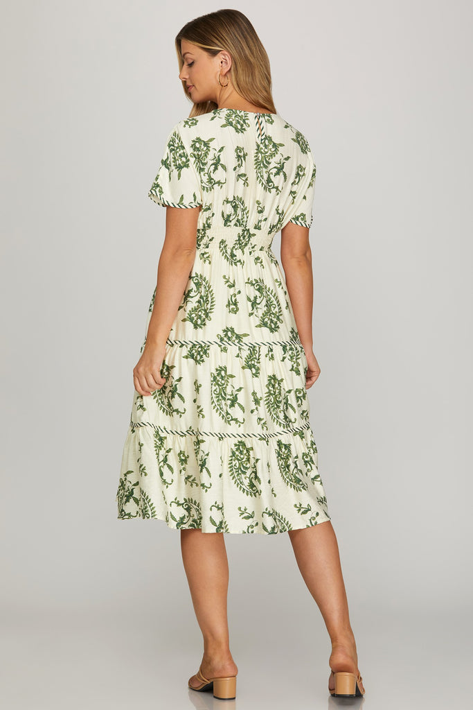 Effortlessly chic and undeniably fun, the Vickie Dress brings together everything you love in one stunning piece. Featuring relaxed drop shoulders, a charming woven print, and flattering waist smocking that cinches just right, this midi dress moves beautifully with tiered layers. The lined skirt keeps things polished while hidden pockets add that practical touch we all crave. Perfect for brunch, date night, or whenever you want to feel put-together without trying too hard.